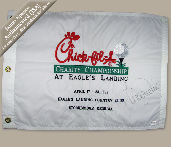 Golf Links To The Past is proud to guarantee the authenticity of every autograph we sell. In addition, we provide appropriate documentation from official licensees who have commissioned private signings or we employ the services of the two leading independent autograph authenticating companies — James Spence Authentication (JSA) and/or PSA/DNA.This autographed flag has been authenticated by JSA.