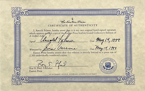 Published by Easton Press in 2004, this leather bound limited edition has been signed by Arnold Palmer as has the COA that accompanies the book. This in depth sports autobiography is a must read and the book is in fine condition.