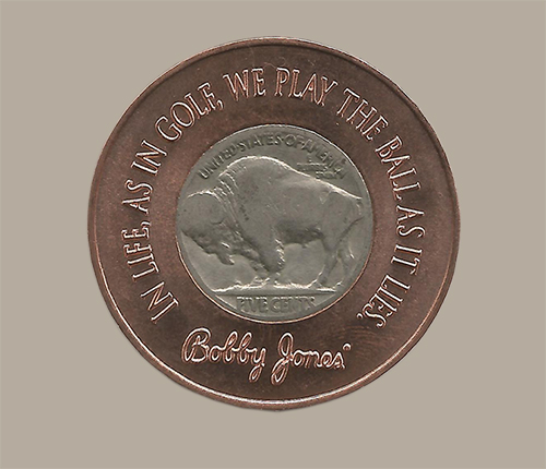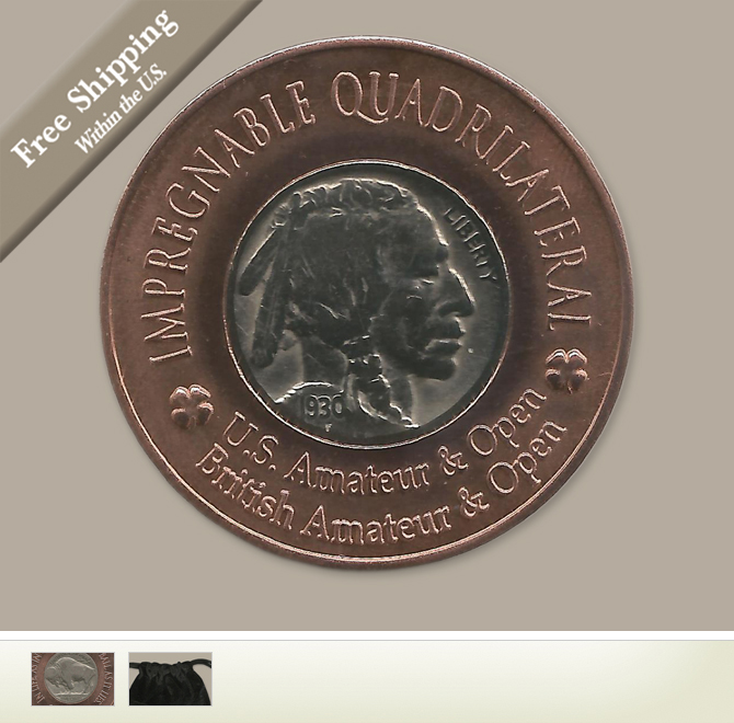 This stunning ball marker commemorates Bobby Jones’ 1930 Impregnable Quadrilateral with a 1930 Buffalo Nickel, which has been surrounded by a solid copper edging with Bobby Jones famous quote on one side and the 4 events comprising the Impregnable Quadrilateral on the flip side. Each ball marker measures 1.5" and comes in a protective, drawstring pouch.