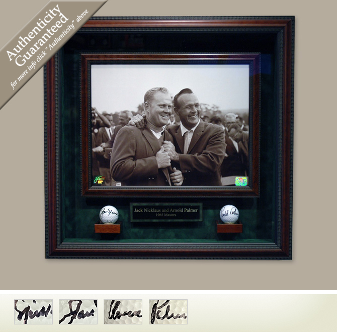 This stunning display contains an 11x14 photo showing Arnold Palmer giving Jack Nicklaus his second Masters jacket on April 11, 1965. Also a vintage golf ball signed by each Masters Champion and is archivally framed to ensure enjoyment for generations to come.