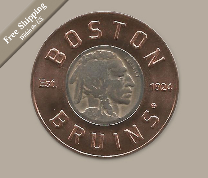 This stunning ball marker commemorates the Boston Bruins birth date with an original 1924 buffalo head nickel and is encased in copper inscribed with the team's name and on the flip side with "Original Six" and the official NHL logo . Each ball marker measures 1 7/16" and comes in a protective, drawstring pouch.