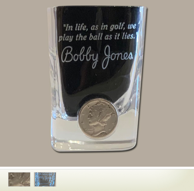 This handsome clear shot glass features an original 1930 Mercury Dime commemorating Bobby Jones’ 1930 Impregnable Quadrilateral. Jones' famous quote has been etched on the front of the shot glass.