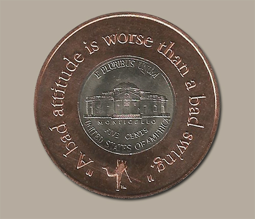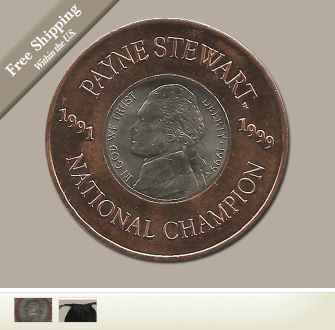 Four months later on Oct. 25, 1999, Stewart died in a plane crash. Stewart was 42 years old.This commemorative ball marker celebrates Payne's two U.S. Open Championships in 1991 and 1999. A copper encasing surrounds a 1999 nickel and the flip side of the coin features one of our favorite Payne Stewart quotes:"A Bad Attitude is Worse Than a Bad Swing".