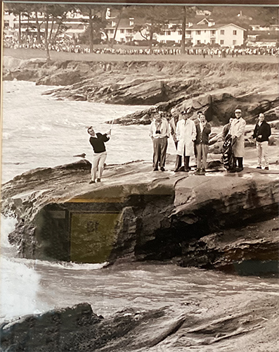 Golfers often face an unannounced competitor — nature itself! Arnold Palmer discovered that for himself in 1963 and 1964 at Pebble Beach, when shots into the rocks on the par three 17th hole wiped him out of contention two years in a row. At the time, local rules defined the rocks as "part of the course." This photo was taken on January 18, 1964 during the Bing Crosby Pro Am. Standing in the middle of the group next to Palmer was three time Masters champion Jimmy Demaret, a commentator at the event who noted that "his nearest legal drop would be in Honolulu." After Palmer hits his shot over the green into shallow, rocky water, he takes a nine on the hole.
