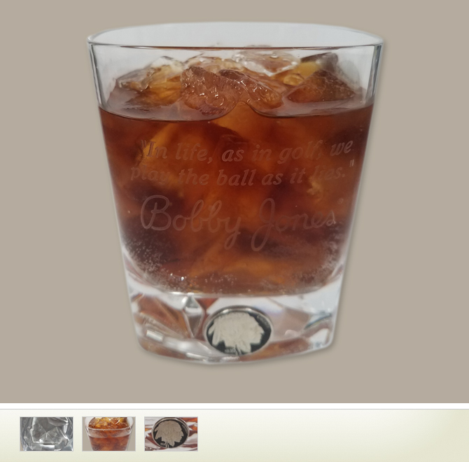 This handsome non-lead crystal double old fashioned glass features a heavily fluted bottom and an original hand enameled 1930 Buffalo Nickel commemorating Bobby Jones’ 1930 Impregnable Quadrilateral. Jones' famous quote has been etched on the front of the glass.
