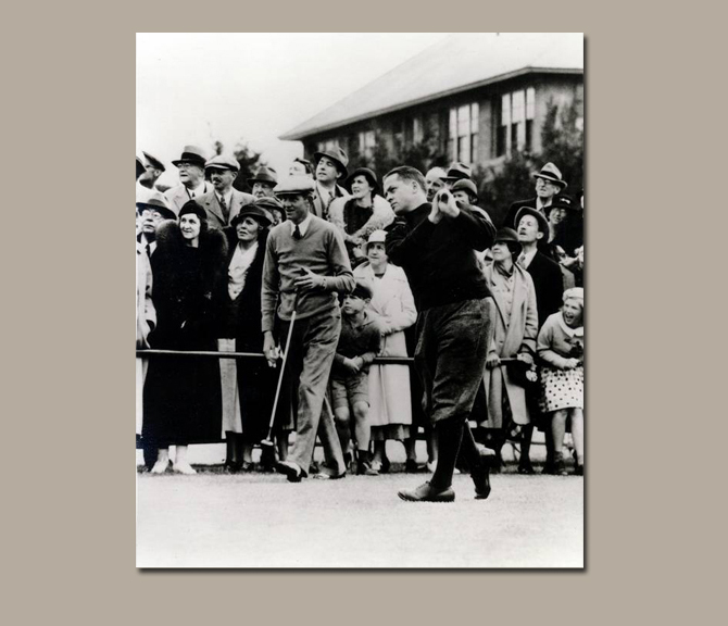 Bobby Jones's drive impresses the crowd and fellow golfer Horton Smith, the Masters first champion.