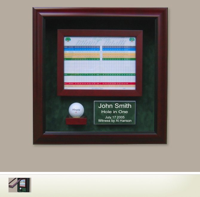 Display your scorecard and ball from your magical hole-in-one! Protective UV glass as well as mahogany door and green suede mat make this a handsome way to display your achievement. Most scorecards fold to 4" x 6". Please advise if your scorecard size is different. Laser engraved plate provided. Please call 800-449-4097 to provide copy.