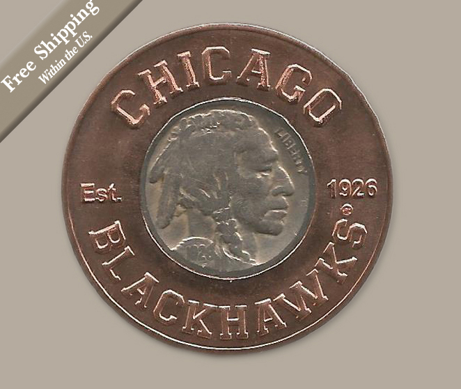 This stunning ball marker commemorates the Chicago Blackhawks birth date with an original 1926 buffalo head nickel and is encased in copper inscribed with the team's name and on the flip side with "Original Six" and the official NHL logo . Each ball marker measures 1 7/16" and comes in a protective, drawstring pouch.