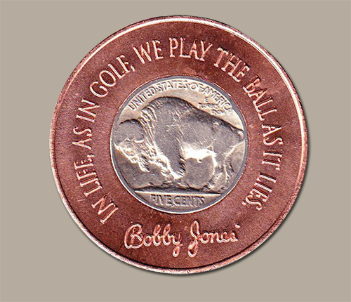 This stunning ball marker commemorates Bobby Jones’ 1930 Impregnable Quadrilateral with a 1930 Buffalo Nickel, which has been surrounded by a solid copper edging with Bobby Jones famous quote on one side and the 4 events comprising the Impregnable Quadrilateral on the flip side. Each ball marker measures 1.5" and comes in a protective, drawstring pouch.