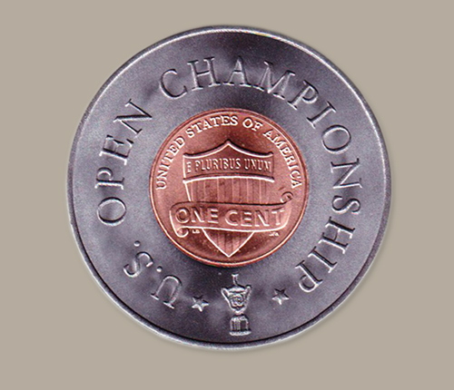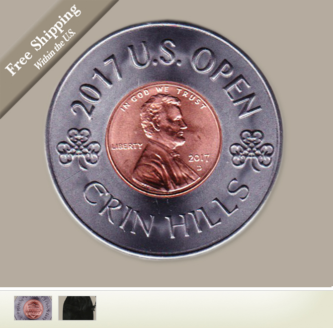 This stunning ball marker commemorates the 2017 U.S. Open using an original 2017 penny which has been surrounded by a steel edging with "Erin Hills 2017 U.S. Open" and the club logo stamped on the rim on one side and "U.S. Open Championship" stamped on the flip side. Each ball marker measures 1 9/16" and comes in a protective, drawstring pouch.
