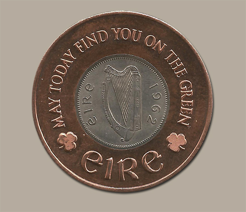 This ball marker features a genuine Irish sixpence coin minted between 1942 - 1969 (specific mint year will vary and cannot be guaranteed) and is encased in copper inscribed with: