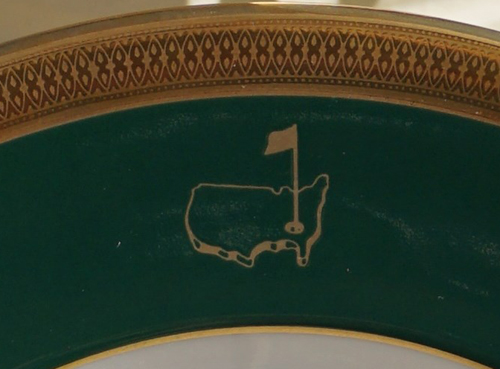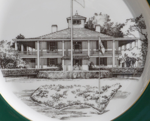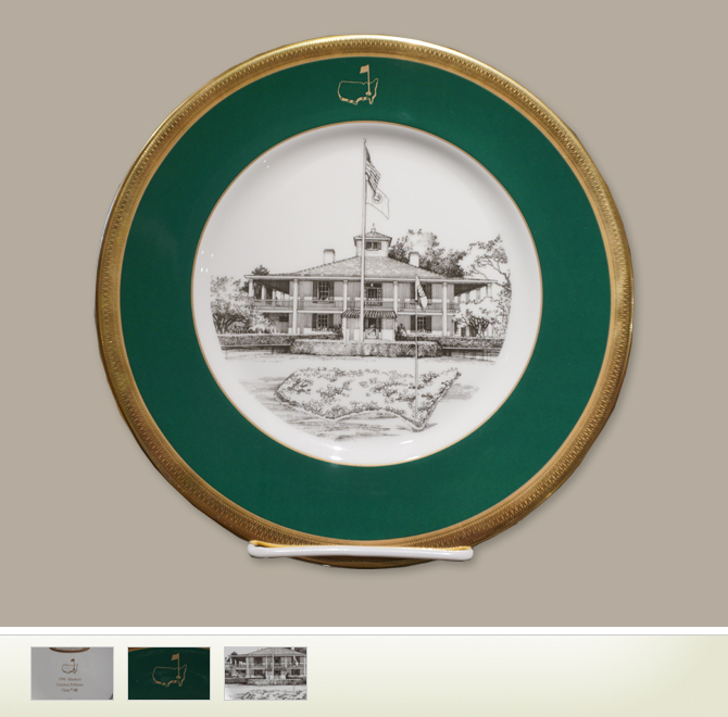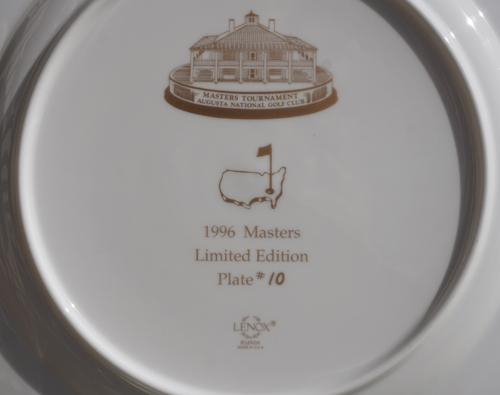 An Augusta National Golf Club dinner plate by Lenox. Given as a gift to members of Augusta National Golf Club and participants of the Masters Tournament beginning in 1992 and ending in 1997, the plates are highly collectible and difficult to find. Featured on the bottom of the plate is the year it was produced and its identification number.