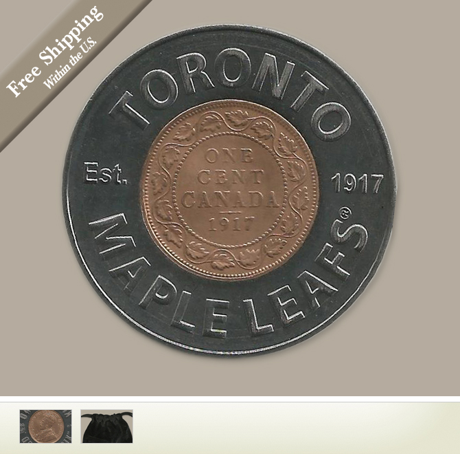 This stunning ball marker commemorates the Toronto Maple Leafs birth date with an original 1917 Canadian penny and is encased in steel inscribed with the team's name and on the flip side with "Original Six" and the official NHL logo . Each ball marker measures 1 13/16" and comes in a protective, drawstring pouch.