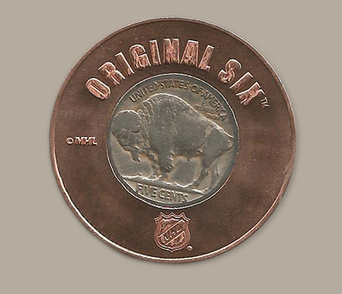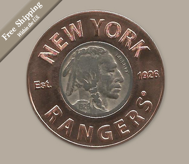 This stunning ball marker commemorates the New York Rangers birth date with an original 1926 buffalo head nickel and is encased in copper inscribed with the team's name and on the flip side with "Original Six" and the official NHL logo . Each ball marker measures 1 7/16" and comes in a protective, drawstring pouch.