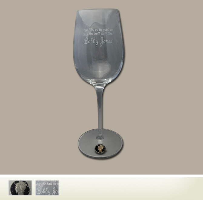 This handsome crystal white wine glass features an original hand enameled 1930 Liberty Dime commemorating Bobby Jones’ 1930 Impregnable Quadrilateral. Jones' famous quote has been etched on the front of the glass.