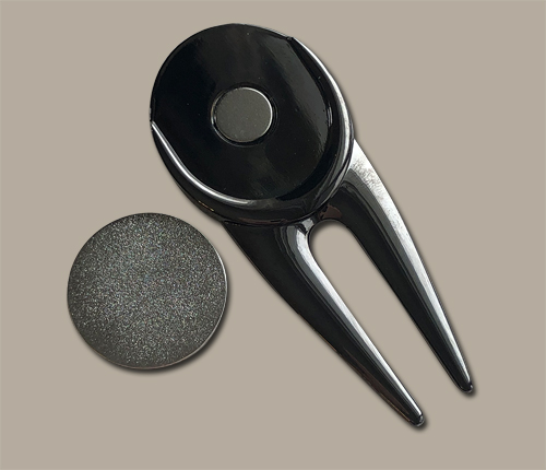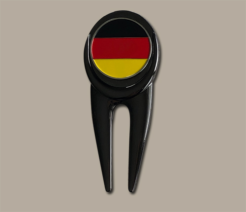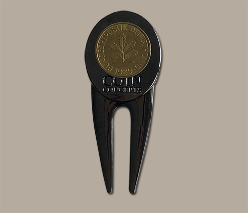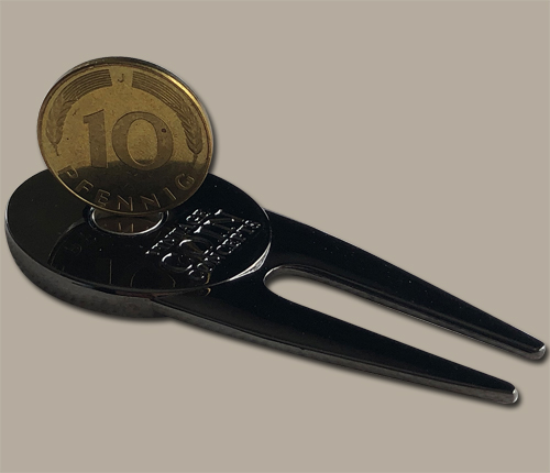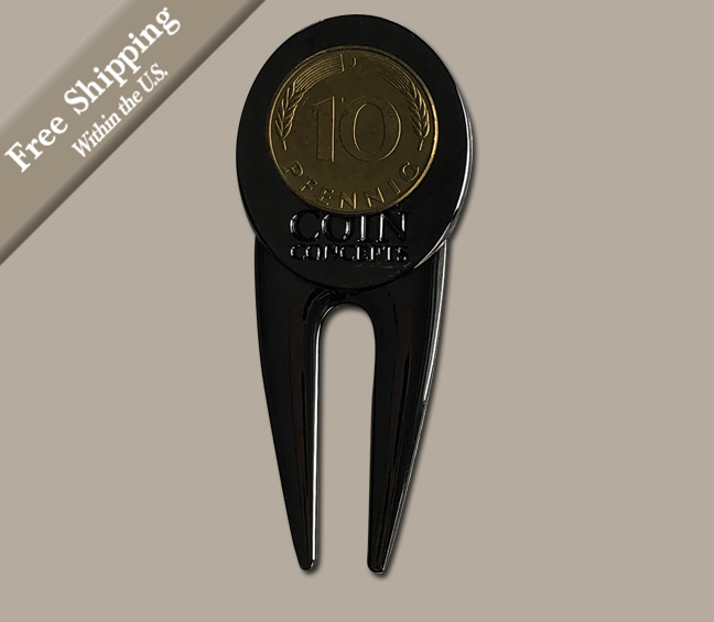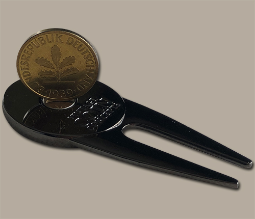 This unique metal divot repair tool with a black nickel finish has a magnet on both sides to hold a German themed ball marker on one side and a genuine German 10 pfennig coin on the other. Most coins are not magnetic, however, coins made of nickel or steel are magnetic. These 10 pfennig coins are brass clad steel and are magnetic.