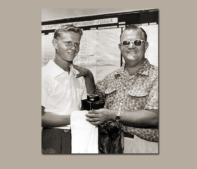 Jack Nicklaus at 13 years of age was the youngest in a field of 128 when he won his first round match of the US National Junior Golf Tournament in Tulsa OK. on July 29, 1953. He is shown with his proud father, L.C. Nicklaus.