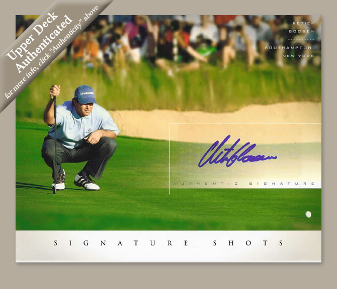 In 2004 and 2005, the Upper Deck Company produced 8 x 10 autographed images on card stock. These pictures present themselves as glossy photographs. The Upper Deck Company commissioned private signings with these stars. The backs of each card expressly warrants the authenticity of the signature of the depicted golfer.