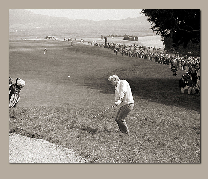 Nicklaus is shown here lofting a soft pitch out of the rough to the 14th green before a big gallery during his march to victory in the '72 U.S. Open. The effectiveness of the shot, which stopped within five feet of the pin, compelled his playing partner, Lee Trevino, to tell him he should play the game left-handed to give his opponents a chance.