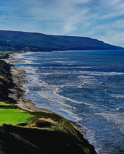 A golfers dream spot! The Cliffs Course is carved through the Cape Breton landscape, with rolling greens, sandy beaches, fog on the water, and mountains in the background.