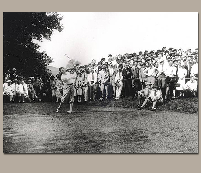 Bobby Jones draws a crowd as he hits this drive during the 1930 U.S. Amateur Championship. Jones always considered the early 18-hole matches to be the hardest to win, simply because the brief play allowed the opportunity for someone to get hot and forge an upset. At Merion the first round would claim Francis Ouimet, Johnny Goodman, George Voight and George Von Elm. However, Bobby would survive to face Gene Homans in the final round, defeating him soundly 8 and 7.