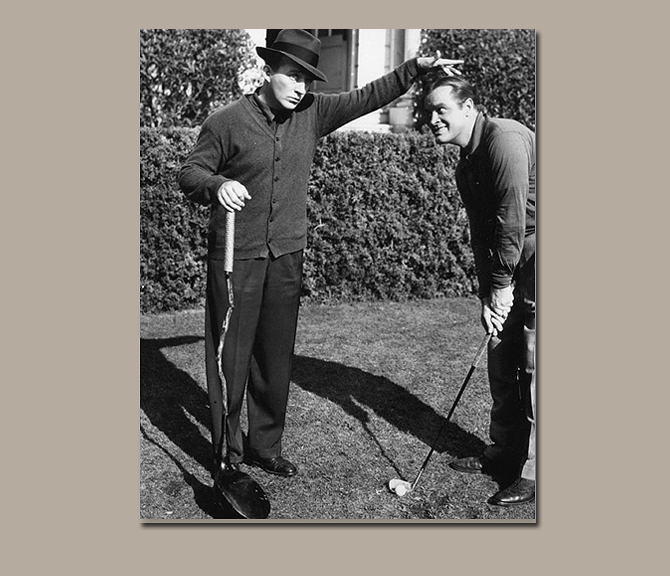 Bing Crosby & Bob Hope are shown doing two of the things they loved — playing golf & clowning around!