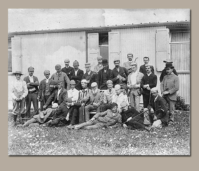 Old Tom Morris is sitting on a bench surrounded by some of his contemporaries - Jack Burns seated on his right side won the Open Championship in 1888, David Brown on Old Tom's left won the Championship in 1886. Hugh Kirkaldy (3 down from Morris on the left) would win an Open at St Andrews in 1891 with his brother Andrew as the runner-up (5th left middle row). Ben Sayers from North Berwick is at Old Tom's feet and Davie Ayton is to the right. Circa 1889.