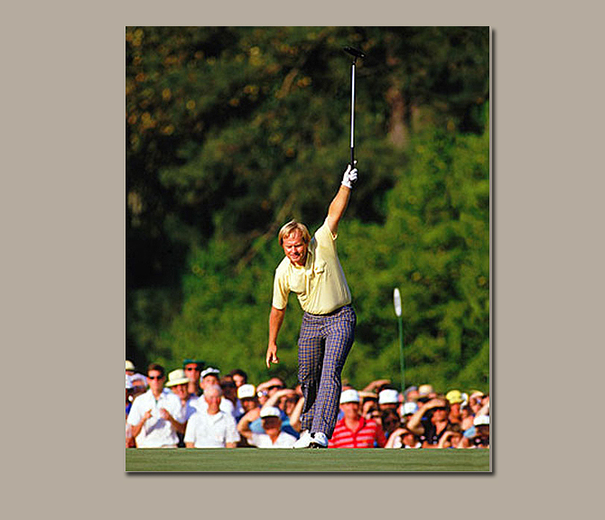 1986 - Jack Nicklaus wins his record setting 6th green jacket and 18th professional major! This photograph captures Jack celebrating his famous birdie putt on the 17th hole.